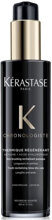 Кerastase Chronologiste Термо-Уход оберегает волосы при завивке или выпрямления плойкой (до 230 нагрева). Можно использовать средство и перед укладкой феном. В составе продукта: витамин Е, абиссин и гиалуроновая кислота.